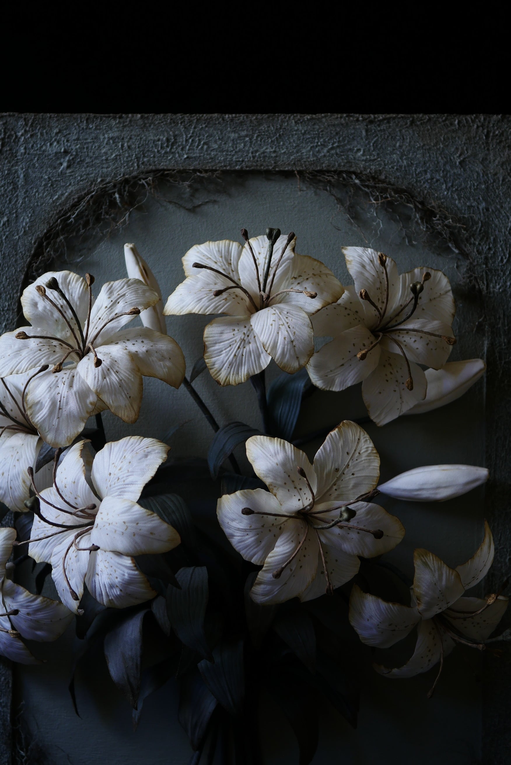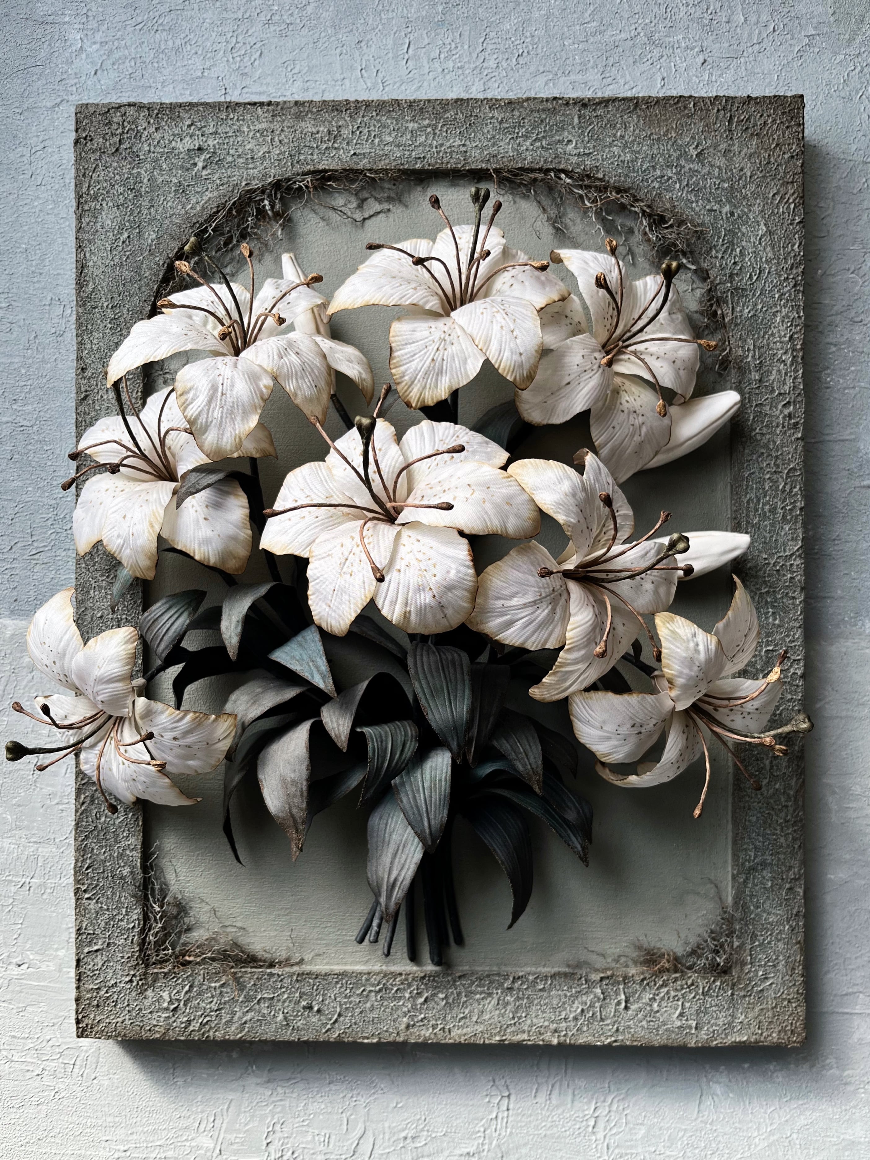 絵画用の木製パネルを加工、塗装し、百合のブーケとあわせました。