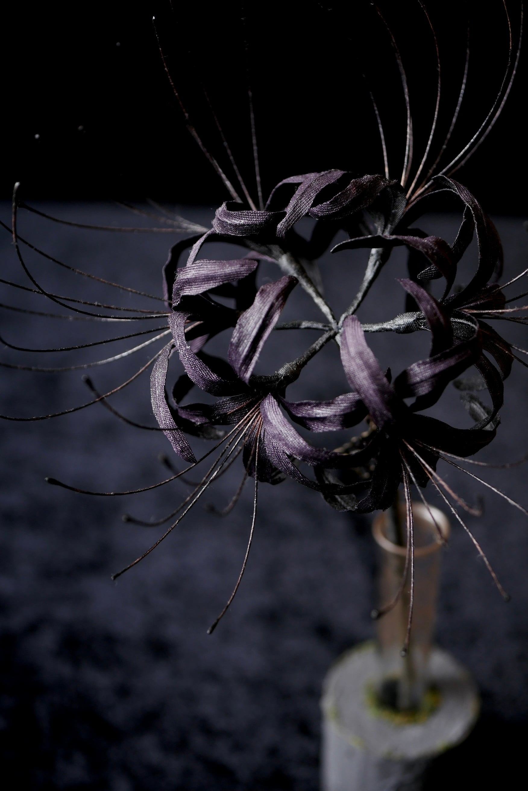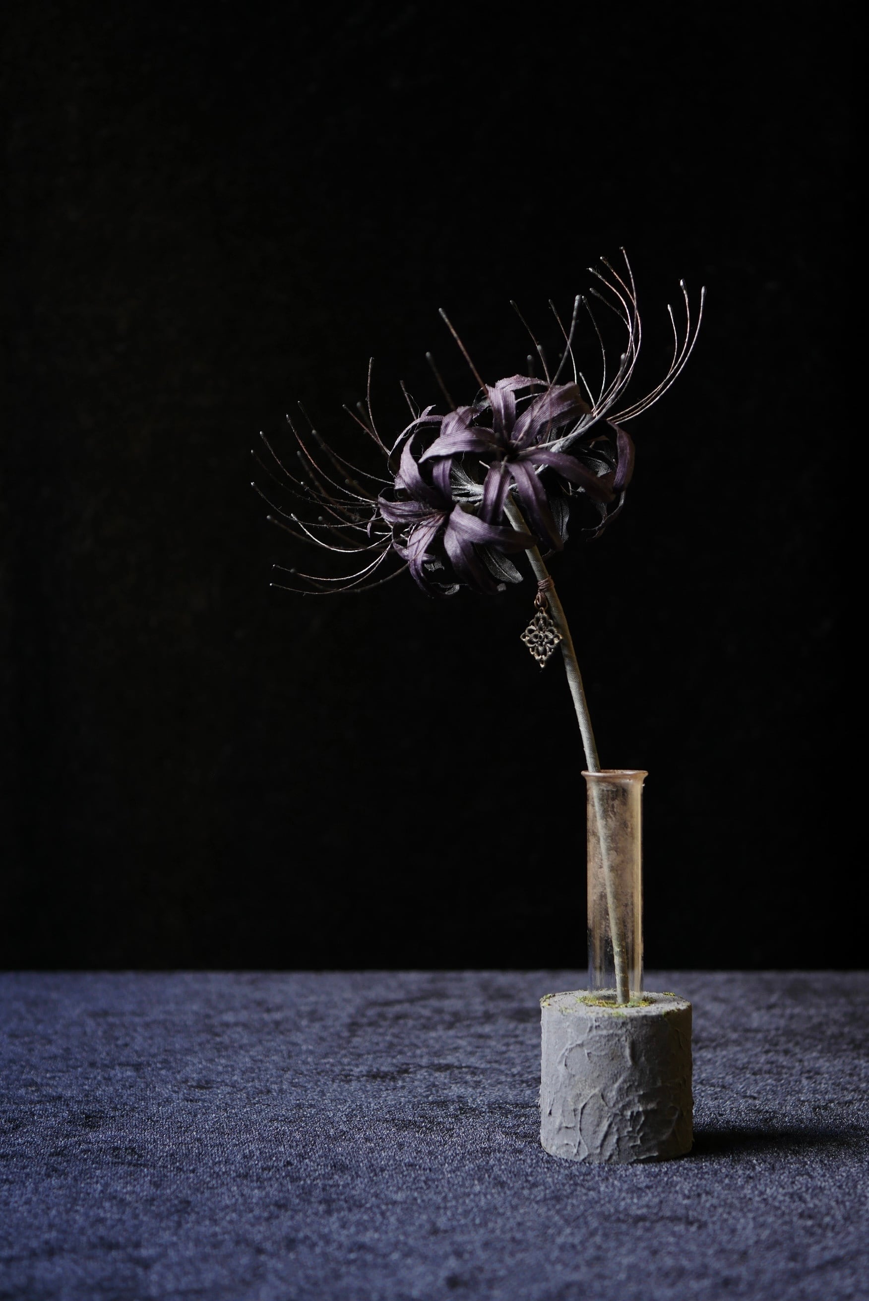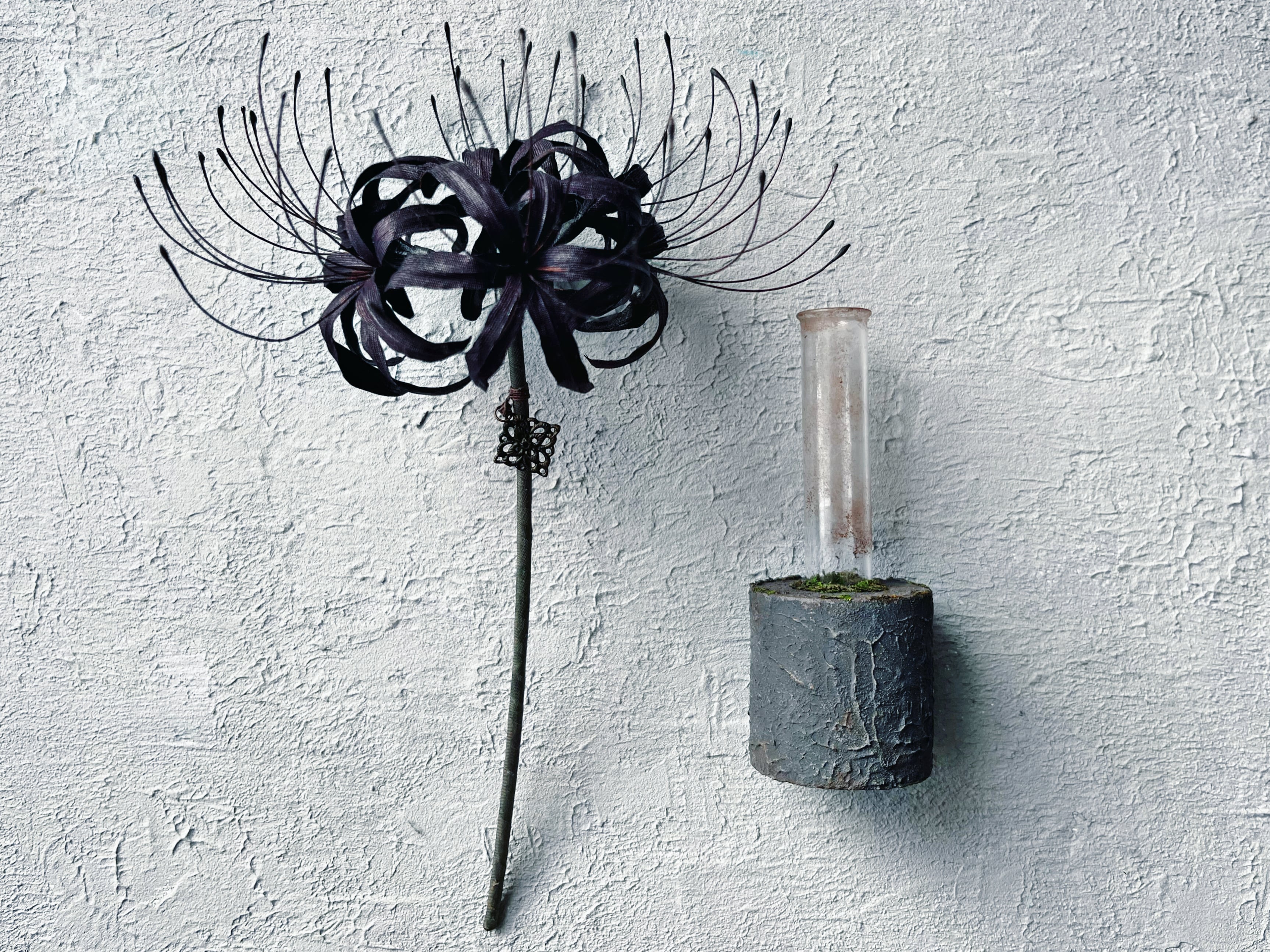 大きく広がる蕊が印象的な黒彼岸花と、一輪挿しのセット作品です。