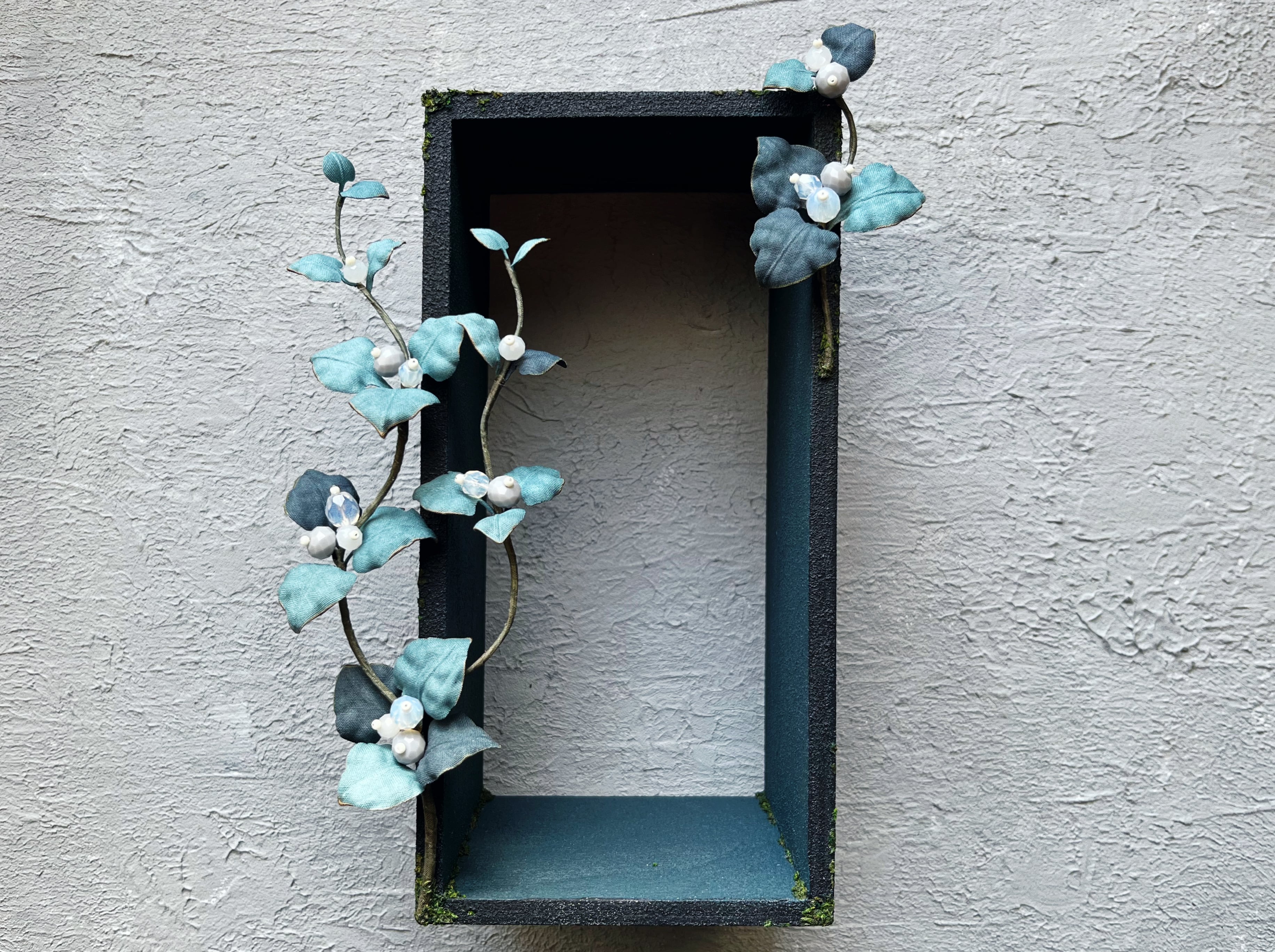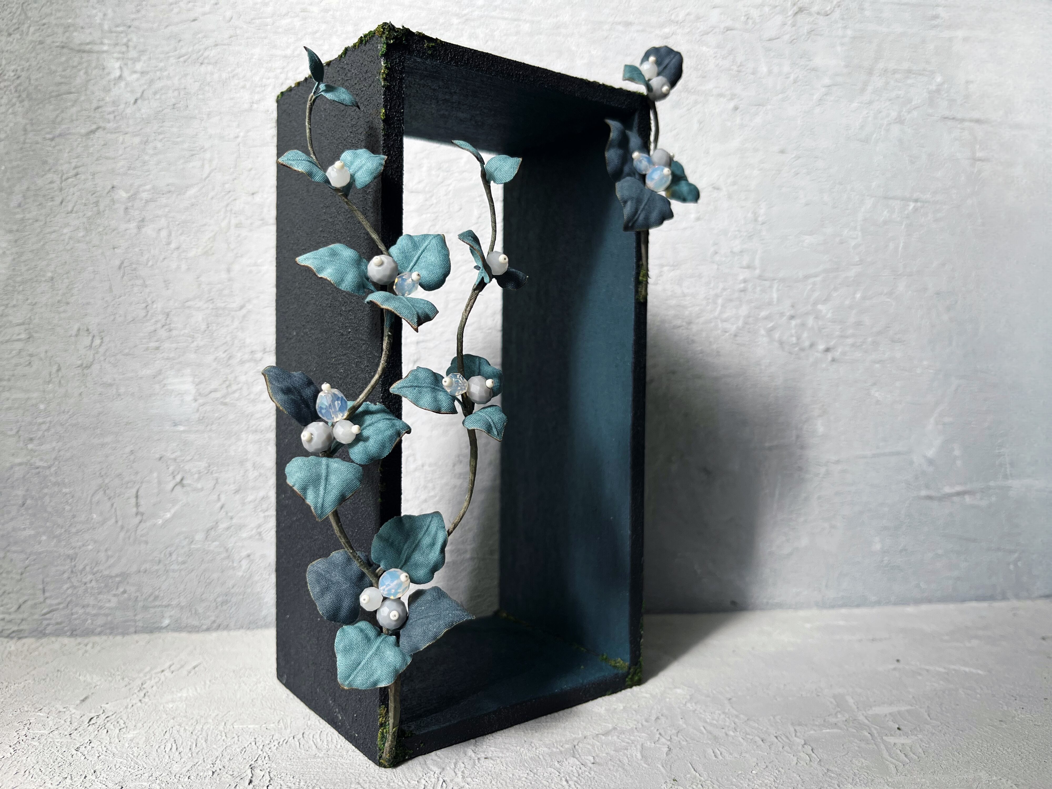 くすんだブルー系に染めたハート型の葉に、実に見立てた数種類のホワイト系ガラスビーズをあわせ組んだ枝をあしらっています。