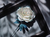 てのひらサイズの芍薬に、ロングタイプのハットピン金具を付けた作品です。
