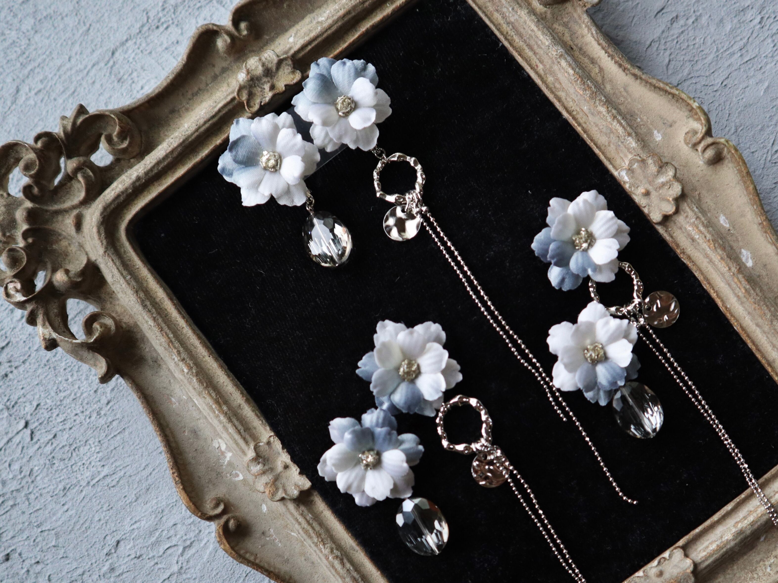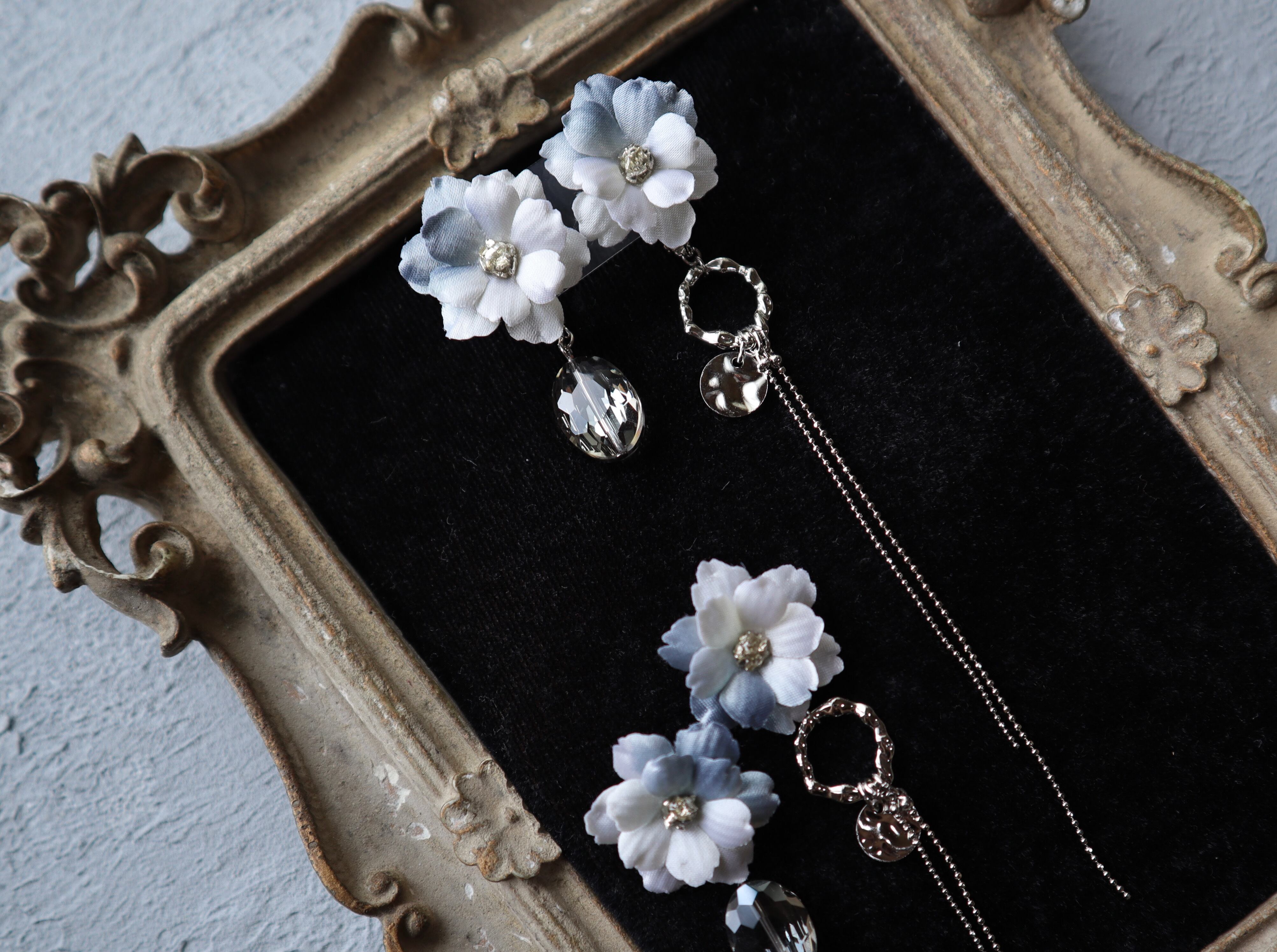 ホワイト×ブルーグレー×シルバーでまとめたアシンメトリーイヤリング。