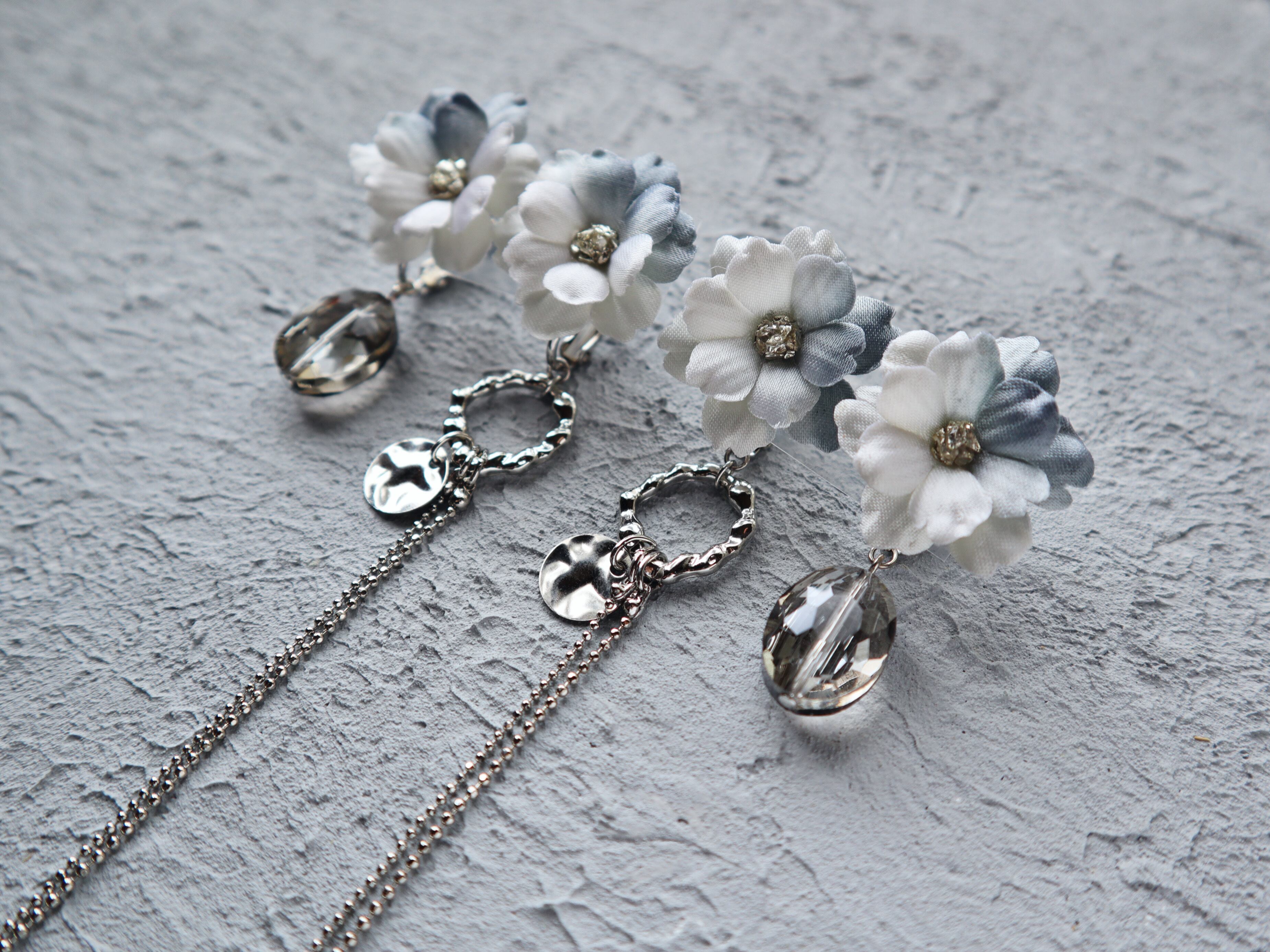 メタルパーツの無機質さに溶け込む布の花をお楽しみください。