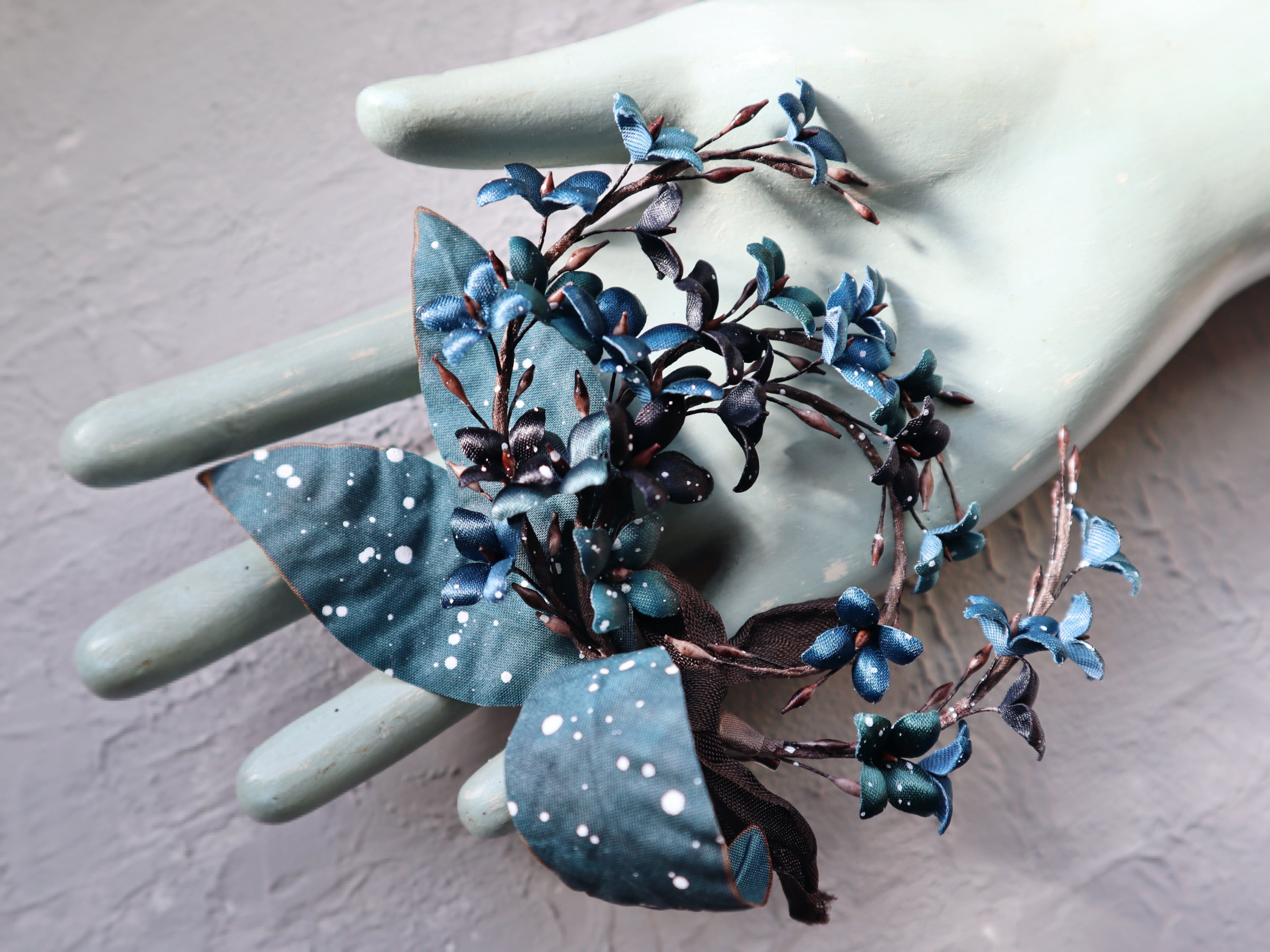 花と葉は貼り合わせで作っているのでほつれることはありませんが、リース状の繊細な作品ですので身に着ける際は慎重なお取り扱いをお願い致します。